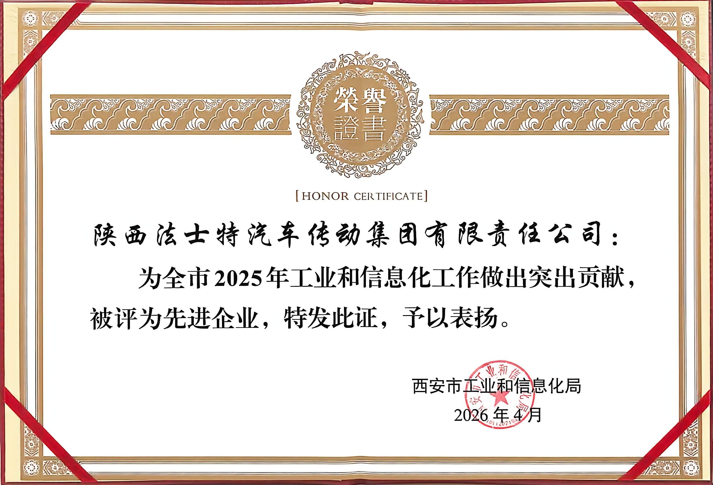 法士特獲評西安市工信系統先進企業