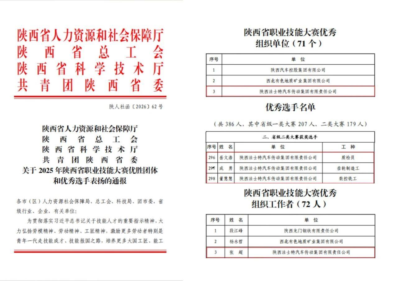 點擊量:29近日,陜西省人力資源和社會保障廳、陜西省總工會、陜西省科學技術廳、共青團陜西省委聯合印發《關于2025年陜西省職業技能大賽優勝團體和優秀選手表揚的通報》。法士特集團在此次大賽中成績突出,斬獲多個獎項。法士特集團獲評“陜西省職業技能大賽優秀組織單位”;法士特員工岳文浩、成勇、董慧慧等三人憑借卓越的專業技能...